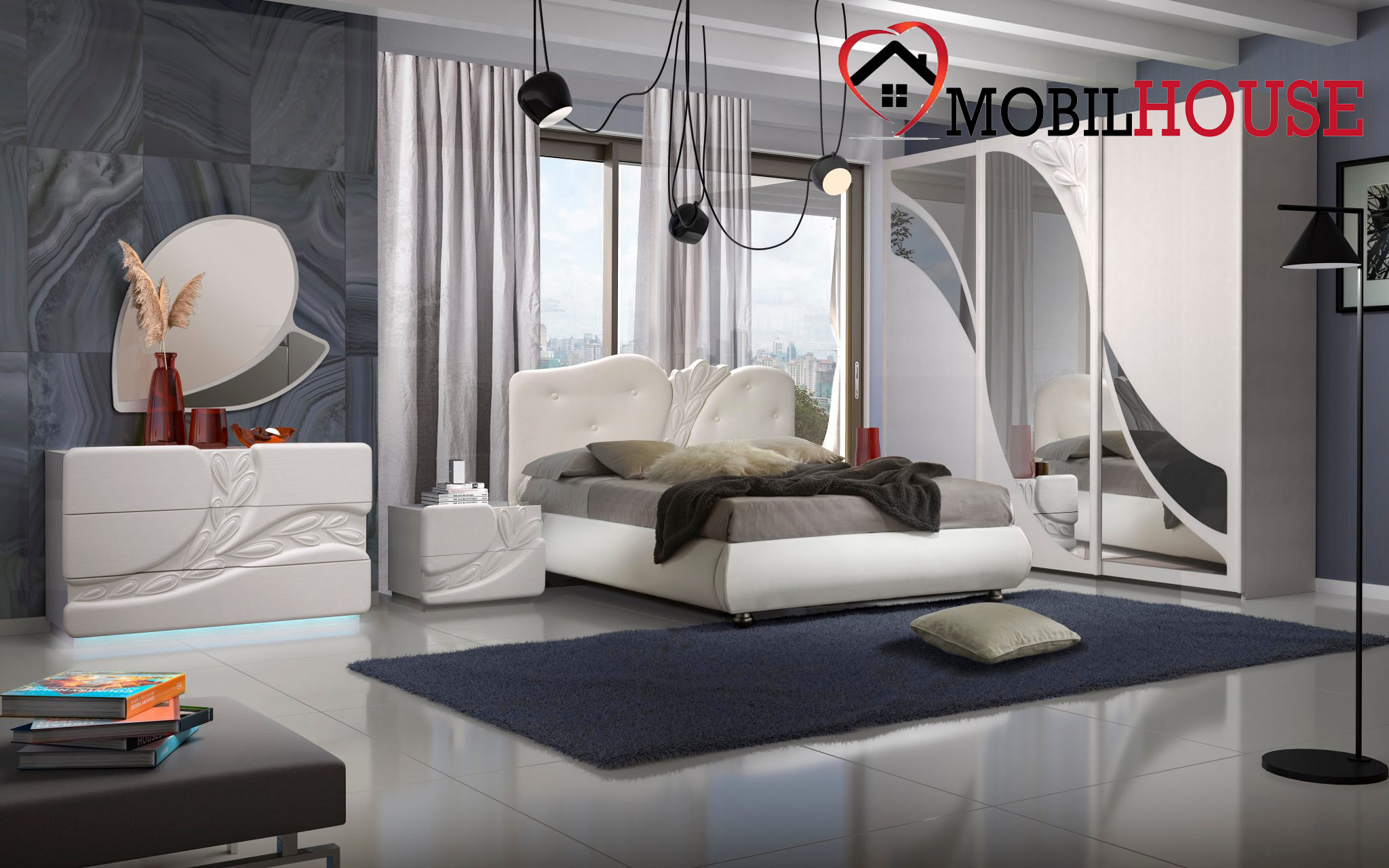 Camera da letto bianco frassino con serigrafie a rilievo, con armadio scorrevole con specchi, completa di como’ e comodini con led e letto a contenitore
