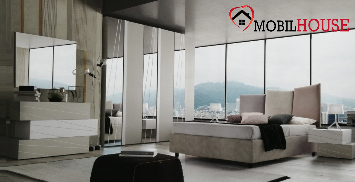 Camera da letto canapa e bianco frassinato , con armadio battente con specchi e glitter, completa di letto a contenitore