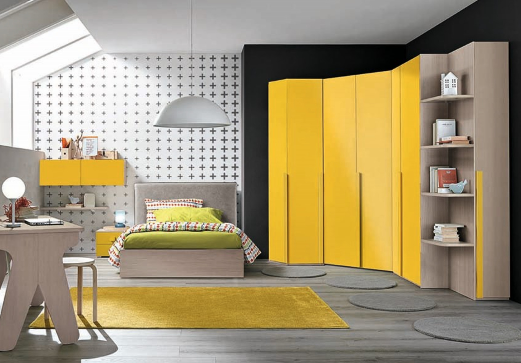 Cameretta moderna nel colore girasole e olmo natura, disponibile in diversi colori e composizioni.