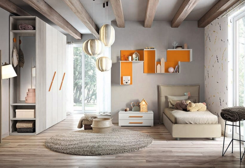 Cameretta moderna nel colore bosco, bianco frassinato e gessato cenere, disponibile in diversi colori e composizioni.