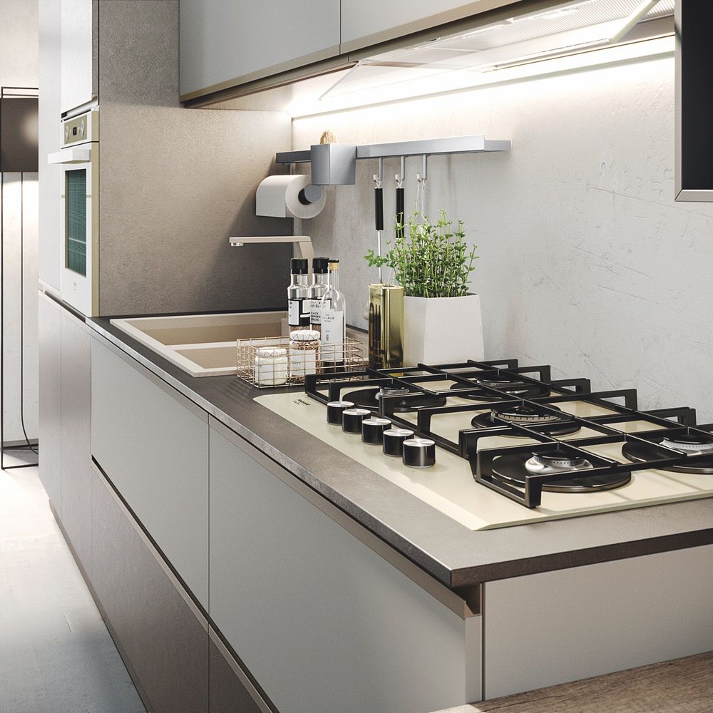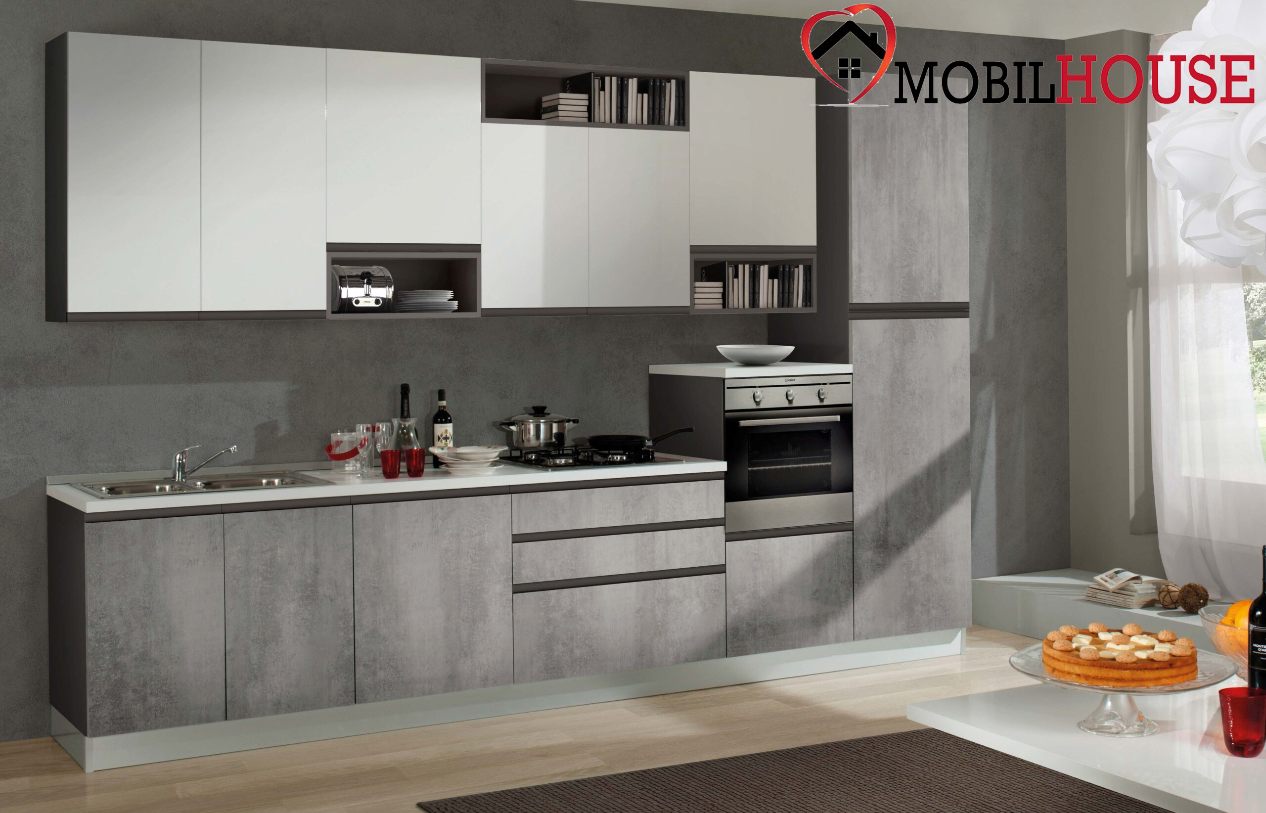 Cucina 3,60mt grigio cemento e bianco gesso, con gola, vani a giorno e mezza colonna forno