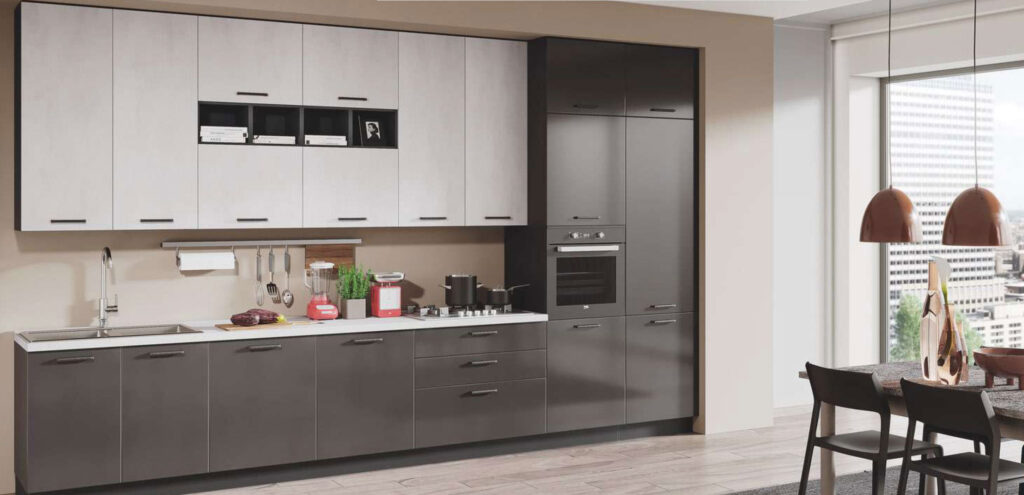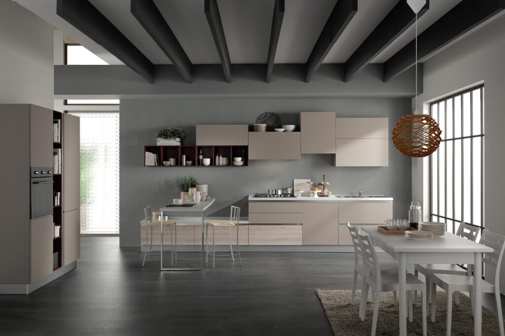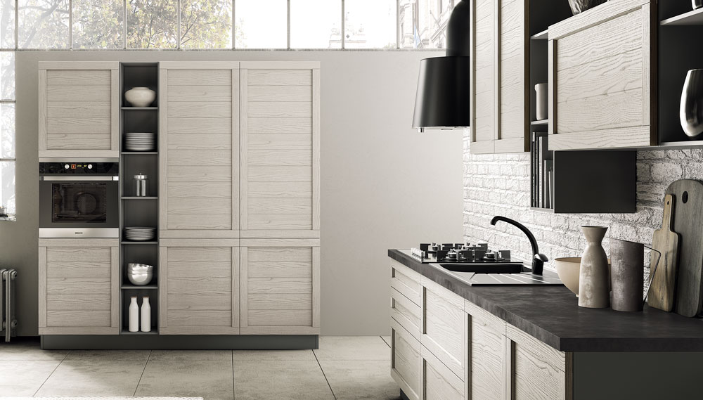 Le composizioni accolgono accessori industrial nelle tinte più attuali come gli elementi a giorno antracite e le cappe Camino e Urban nella finitura titanio.