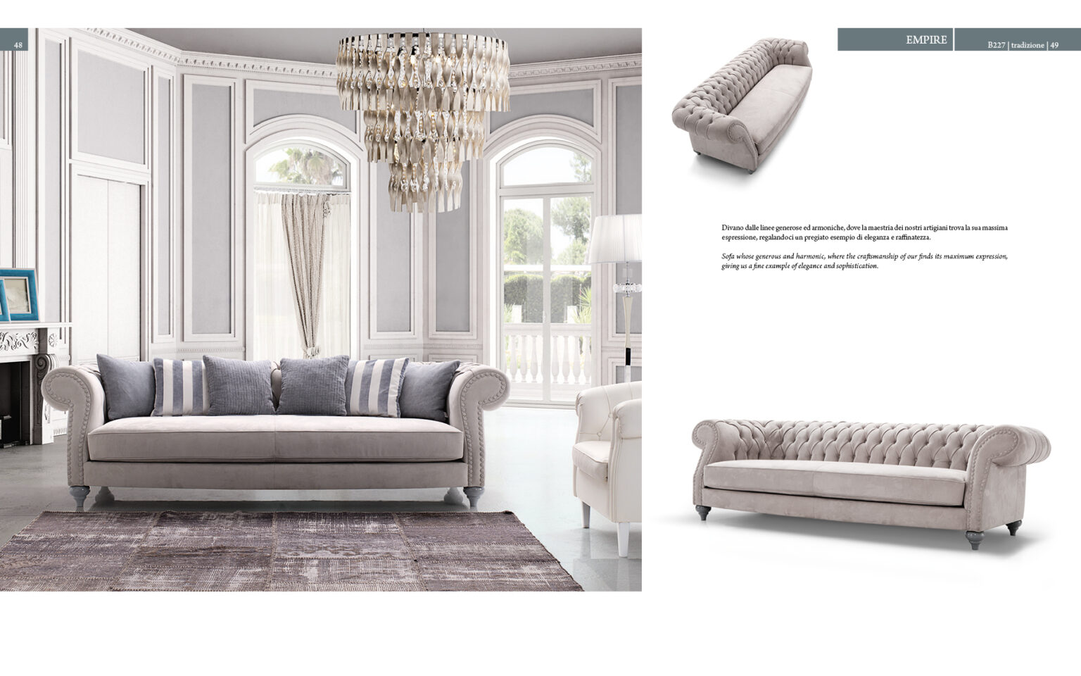 EMPIRE B227 è un divano dalle linee generose ed armoniche, dove la maestria dei nostri artigiani trova la sua massima espressione, regalandoci un pregiato esempio di eleganza e raffinatezza.