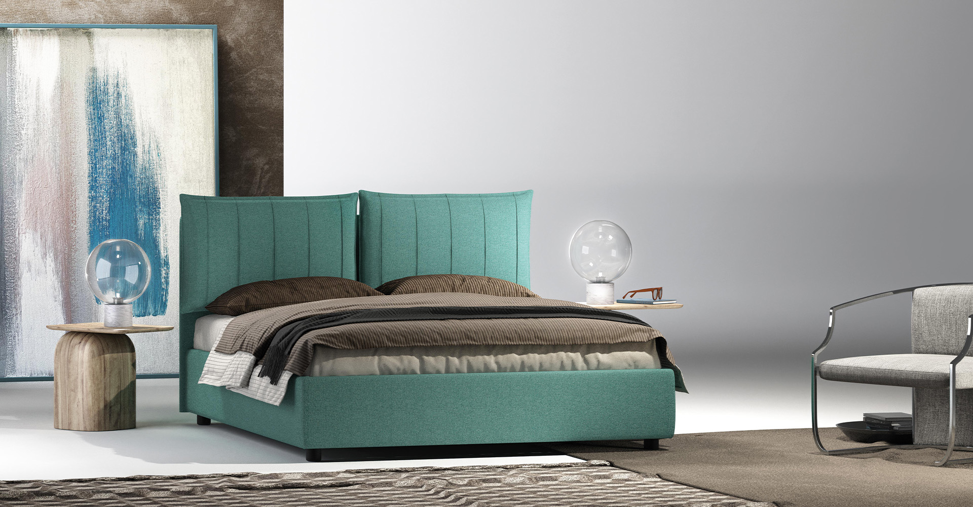 Attraversati da cuciture longitudinali, due cuscini semirigidi compongono la testata, creando un dinamico punto luce al centro. Disponibile con fascione line, soft o slim, anche nella variante con contenitore.