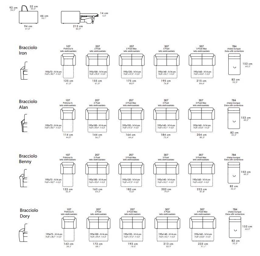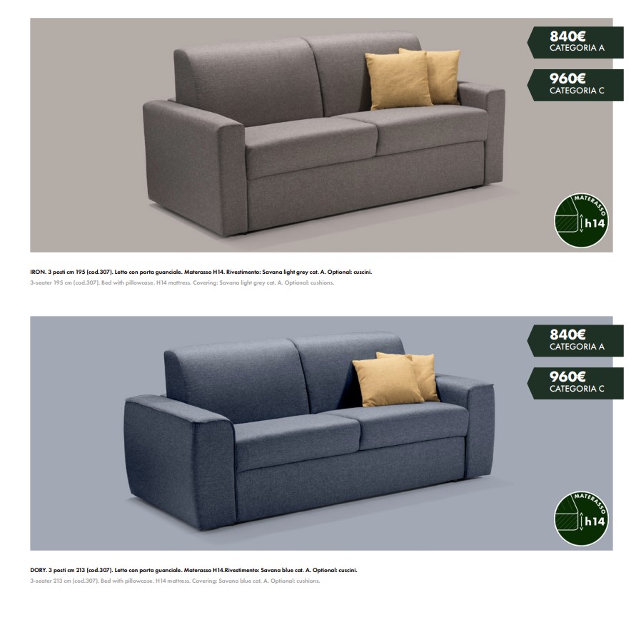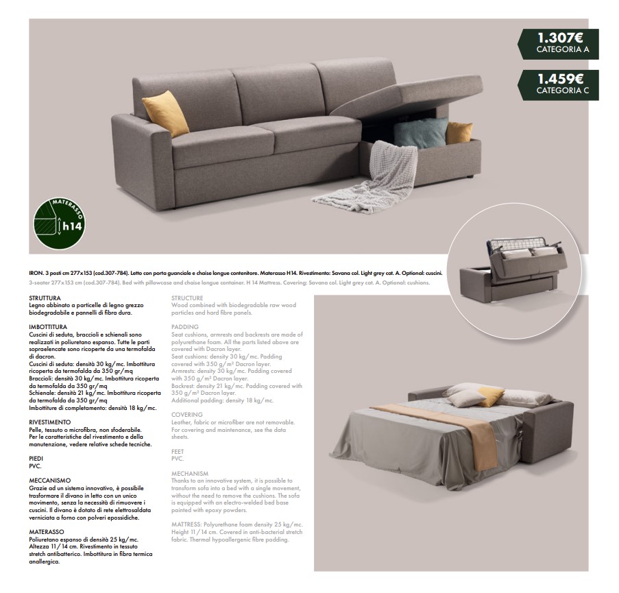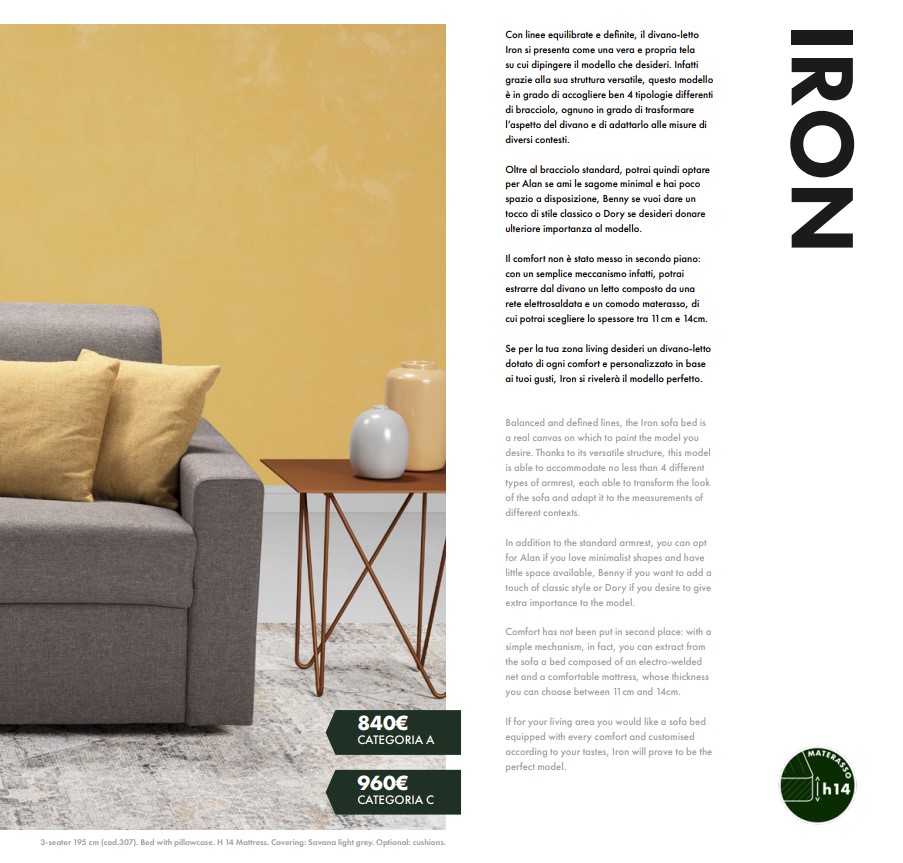 Il divano letto IRON è disponibile in diverse composizioni, colori e tessuti.