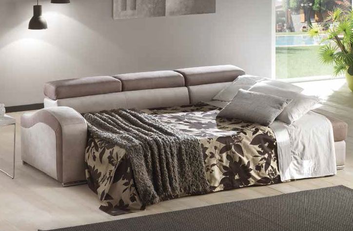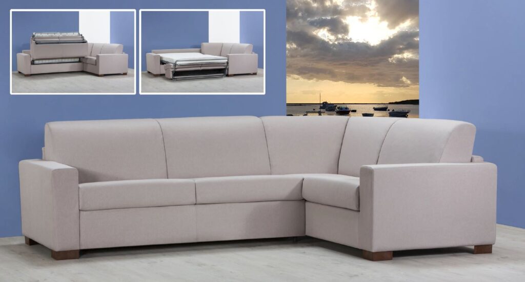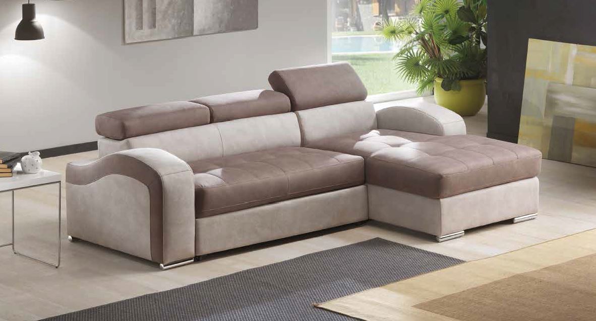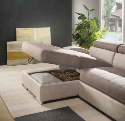 Divano letto angolare con chaise-longue estraibili, 3 meccanismi poggiatesta reclinabili.
