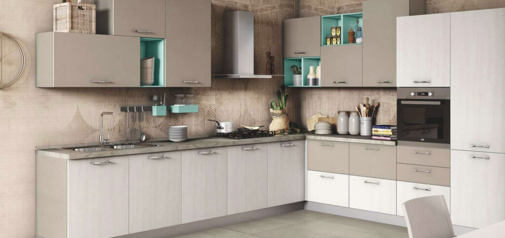 Cucina moderna completa di 5 elettrodomestici, in diversi colori, finiture e composizioni.