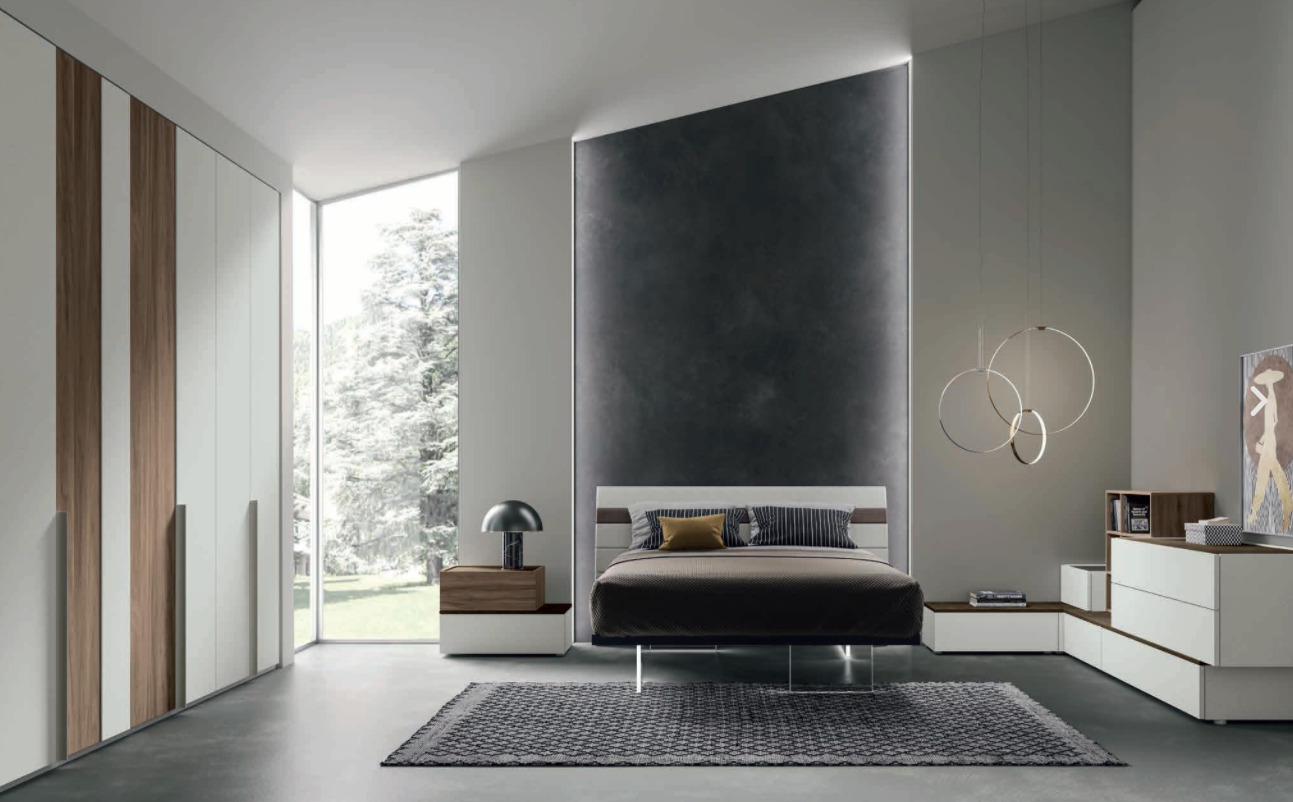 Camera da letto modera in econabuk grafite e laccato ossido ottone, disponibile in diverse composizioni e colori.
