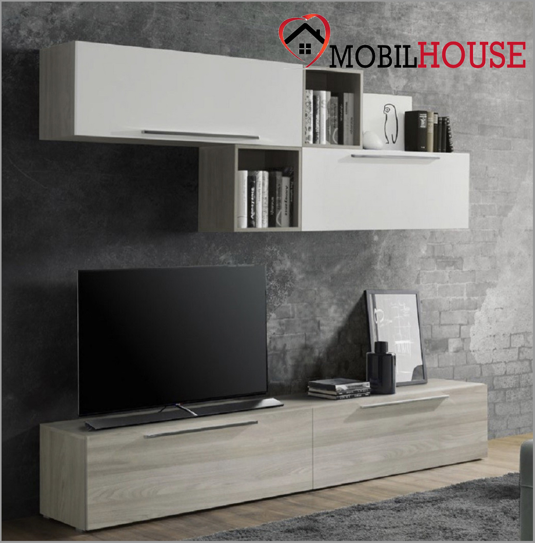 Parete attrezzata olmo e bianco lucido, con vani a giorno