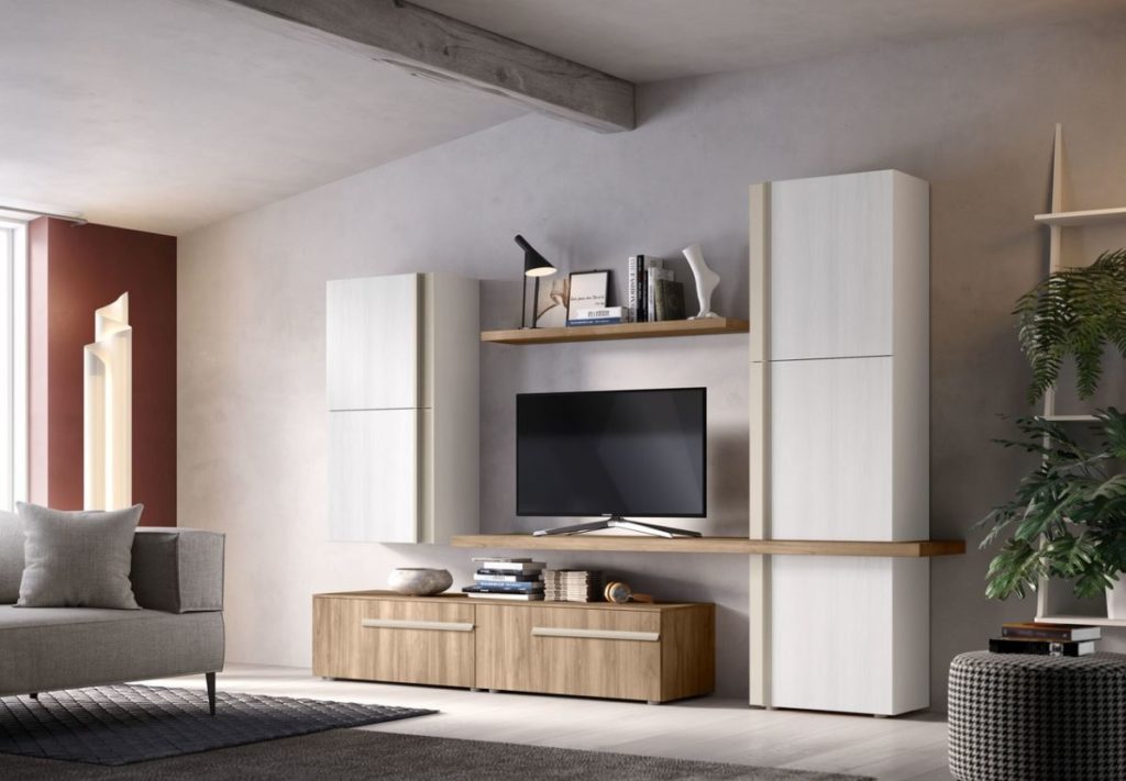 Parete attrezzata bianco lucido e cemento , con vani a giorno
