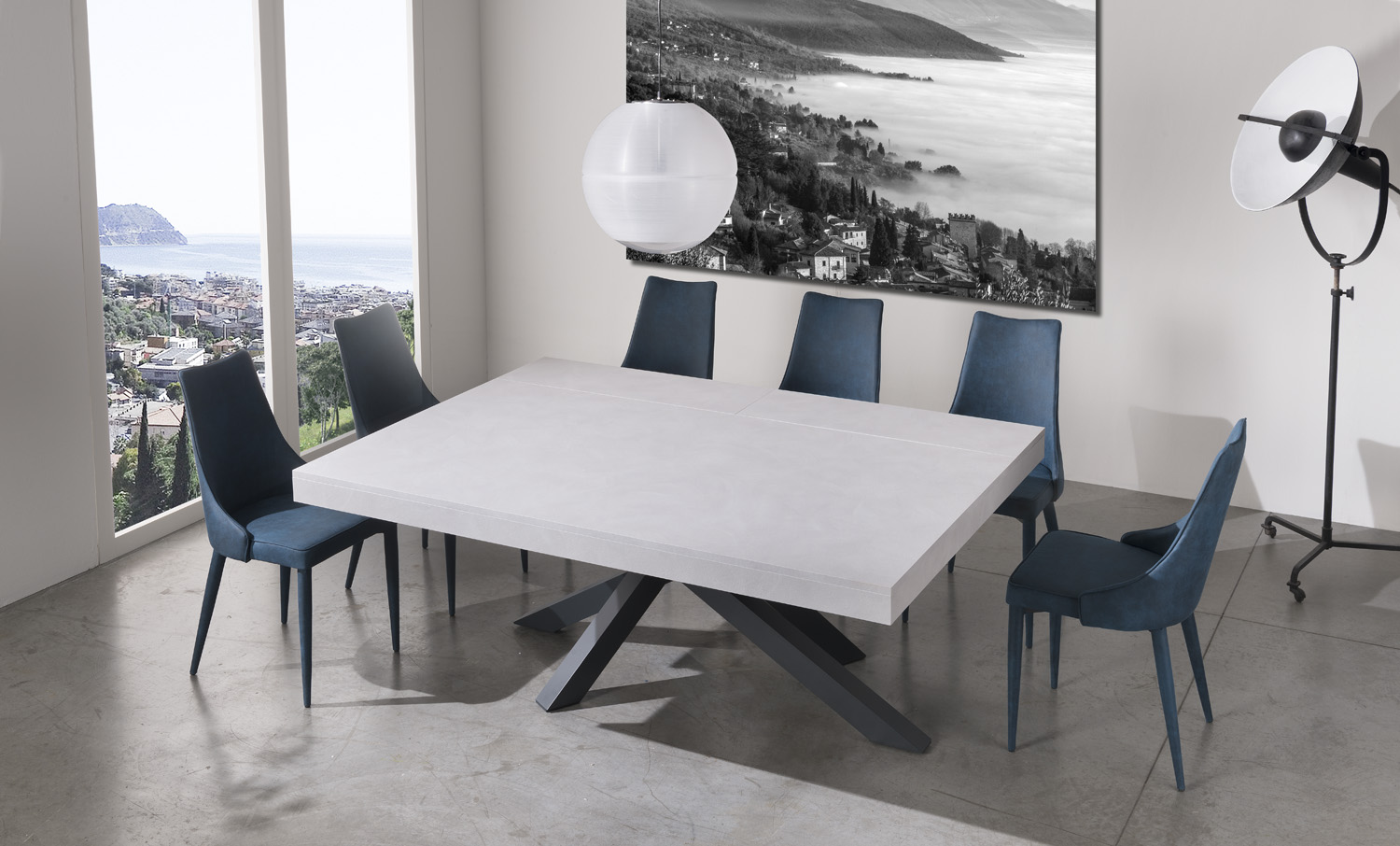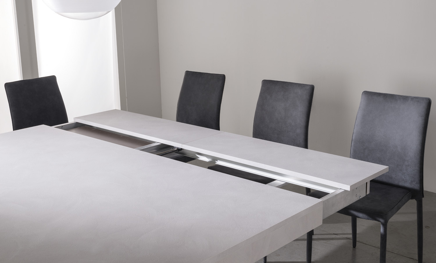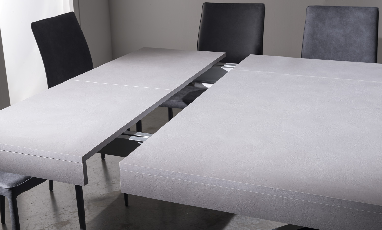 Tavolo allungabile e allargabile lateralmente , piano in unico pezzo ,con basamento interamente in alluminio anodizzato , sistema di allungo interamente in alluminio anodizzato , piedini regolabili , piano a lavorazione folding spessore 22mm , bordo 80mm, disponibile in laminato , impiallacciato in frassino,rovere nodato o rovere spaccato , tre allunghe a libro alloggiate all’interno del tavolo.