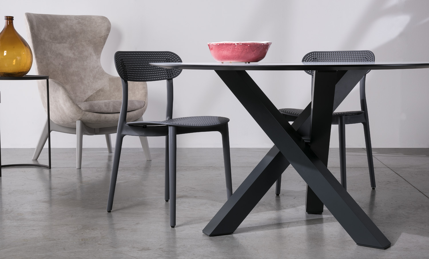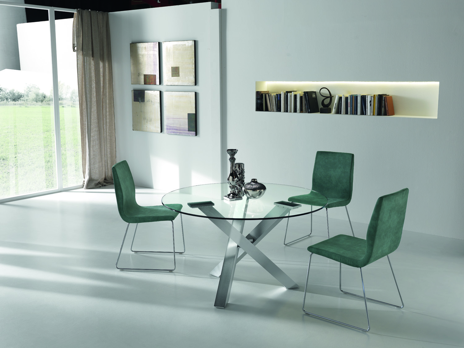 Tavolo moderno fisso con piano in vetro temperato spessore 12mm a basso assorbimento di umiditá, piedini regolabili. Disponibile in diversi colori.