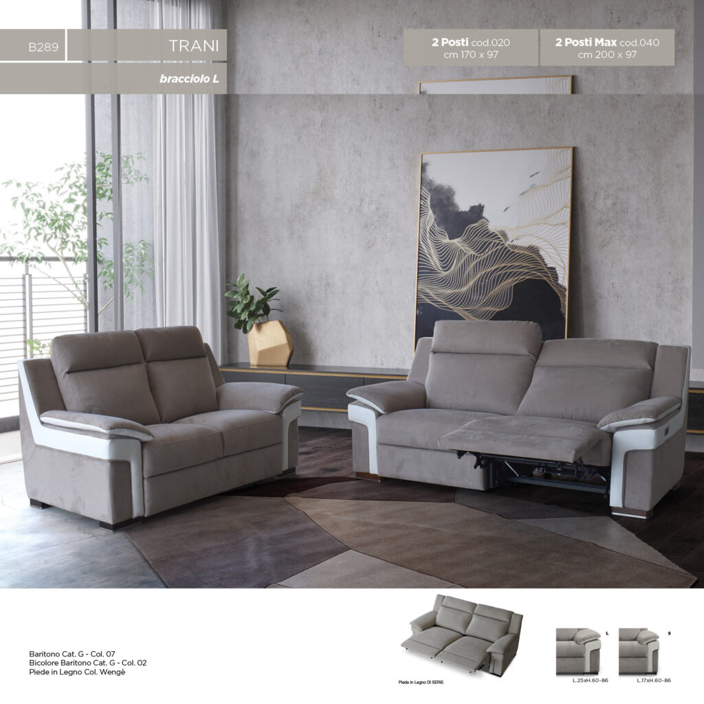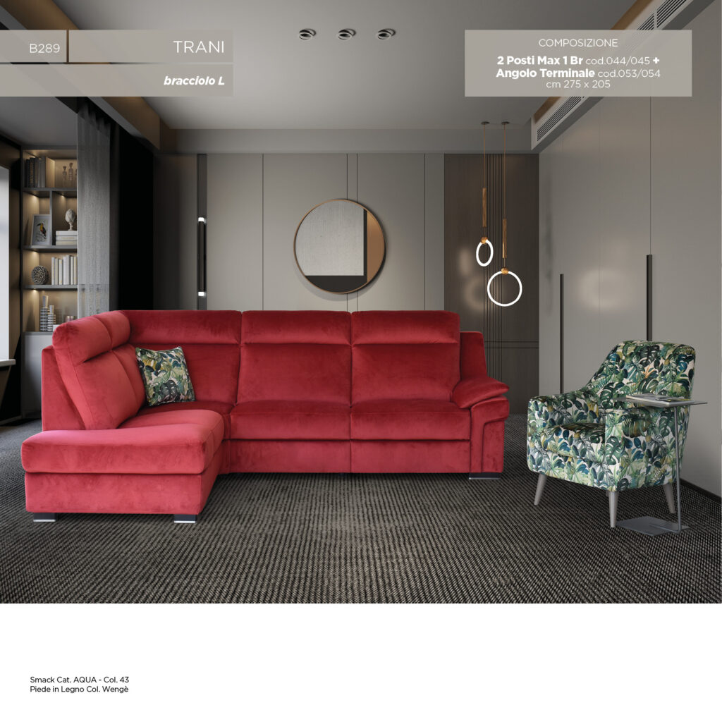 Il divano TRANI B289 è disponibile in diverse composizioni, colori e tessuti. Disponibile con o senza braccio.