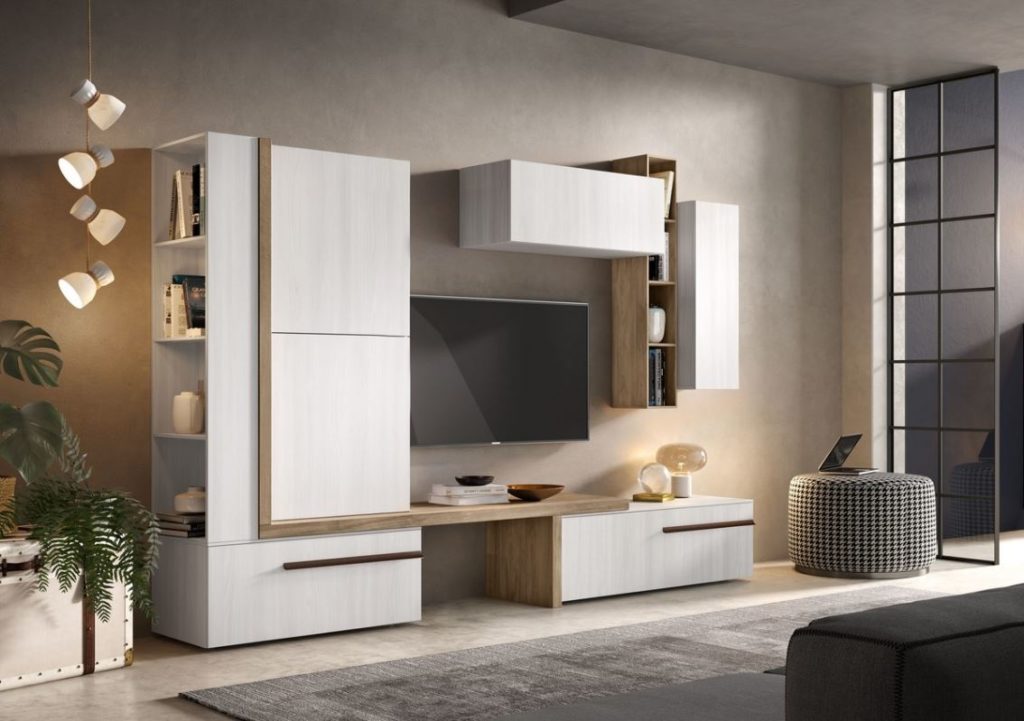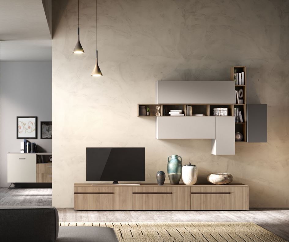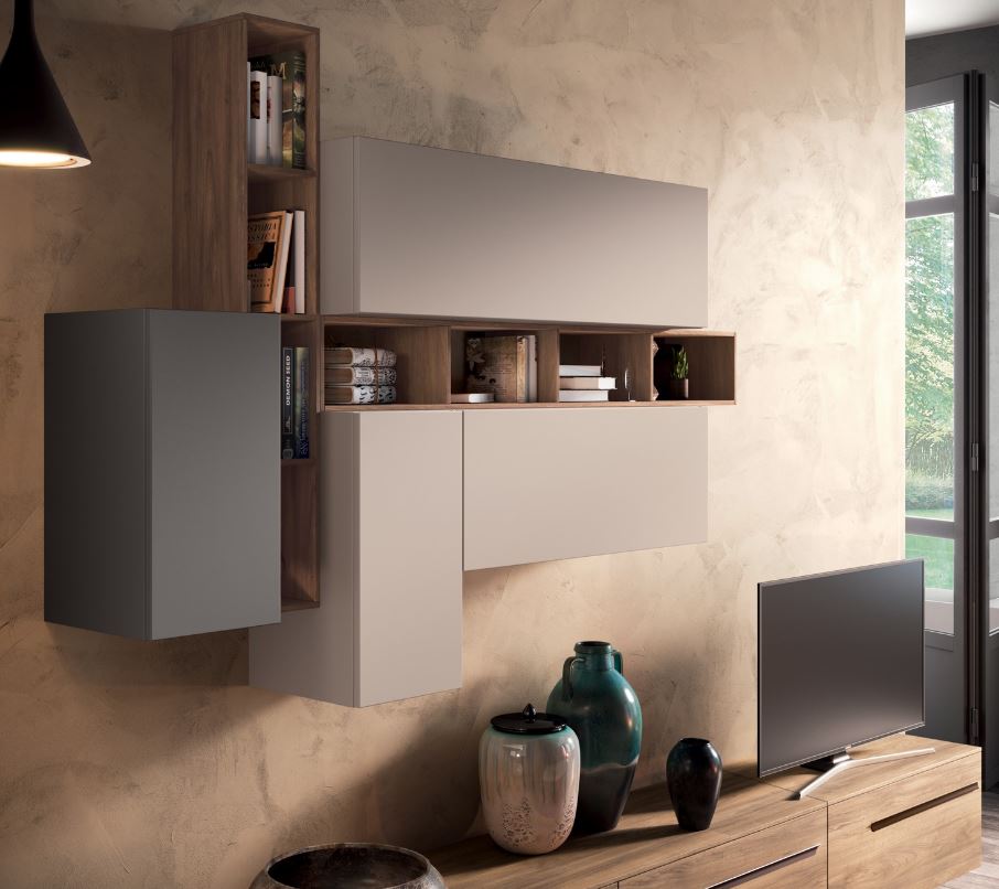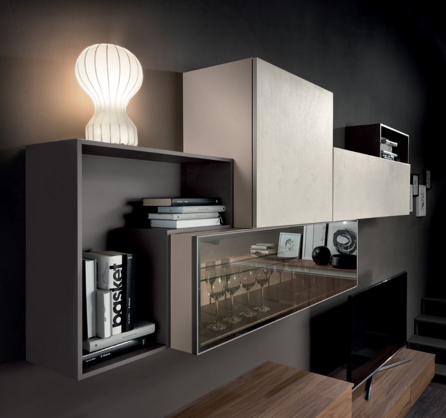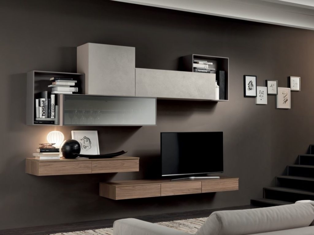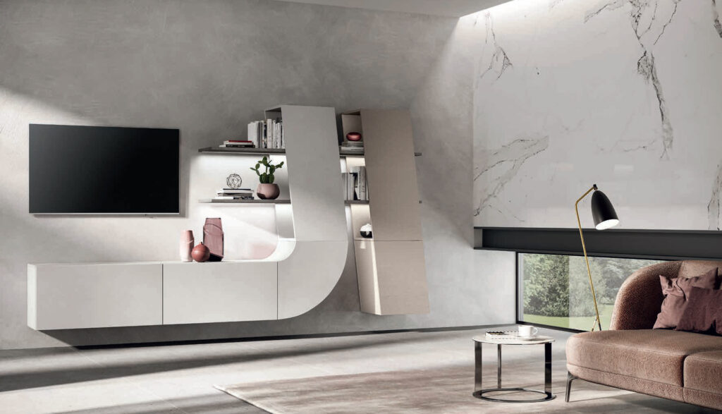 In foto: cassa cemento bianco, frontali cemento bianco e noce Manhattan, top noce Manhattan, totem pietra grigio chiaro